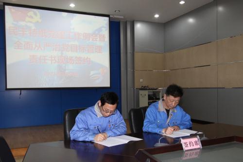 会上,Z6尊龙特纸党委书记曹继华与二分厂、机修分厂、Z6尊龙医院三个单位的党支部书记进行了《2021年度全面从严治党主体责任目标管理责任书》现场签约。其他签约会后进行。